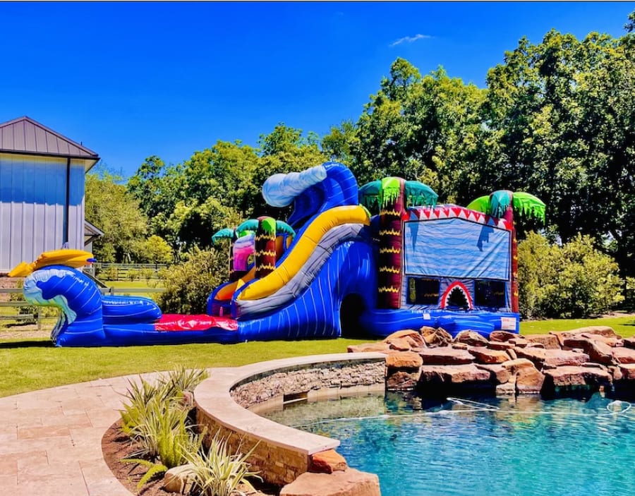 Looking to make a splash at your next party in Katy TX? 🦈 Look no further than our Xtra Large Shark Attack Double Lane Slide & Bounce House Combo Rental! This thrilling inflatable combo features an extra tall dual lane slide with an inflatable landing area that can be transformed into a splash pool, perfect for those hot days. With climbing, jumping, sliding, a basketball hoop, obstacle poles, and a tunnel, this inflatable will keep the kids entertained for hours!