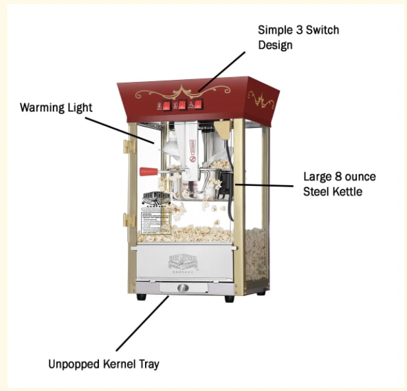 Our Matinee popcorn machine offers a hassle-free popcorn popping experience. Equipped with a stainless-steel kettle and a built-in stirrer, this popcorn maker ensures that each kernel is perfectly popped and ready to enjoy. The tempered glass food zones add a touch of safety while allowing you to watch the popcorn magic happen in real time. Cleaning up is a breeze with the reject kernel tray and easy-to-wipe interior, making this popper a convenient choice for any party host. 🎉🍿