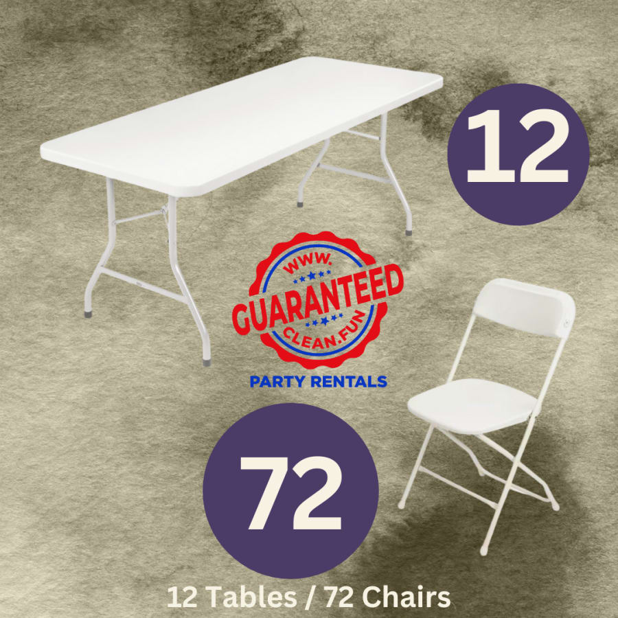 Transform your event space with our premium table and chair rentals, offering a blend of elegance, comfort, and durability. Our 72 Pack of White, Clean, and Classy Chairs, paired with 12 Rectangular Six-foot Tables, is the perfect solution for any event, from sophisticated weddings to professional conferences and casual gatherings.